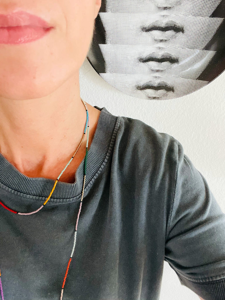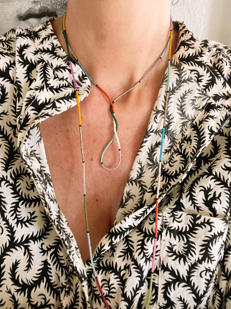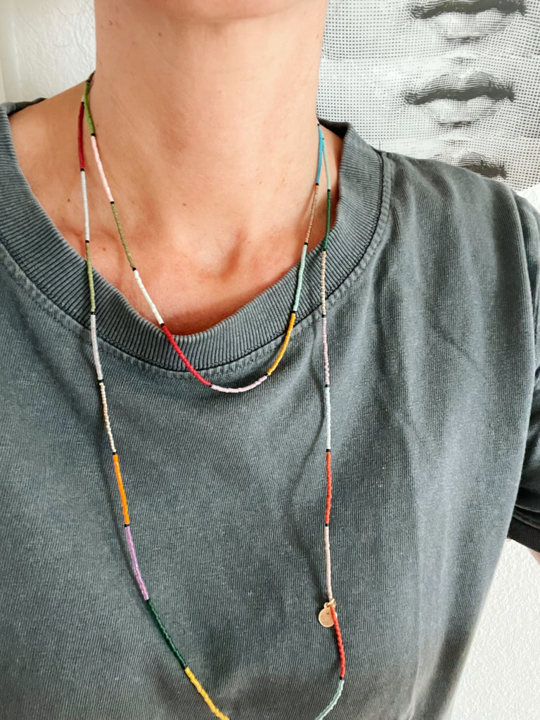 It's light. It doesn't feel heavy on you. This handmade necklace is easy to put on and it can be worn in a number of ways for a trendy look or wrapped around the wrist as an elegant bracelet. A lightweight accessory that won't break the bank!