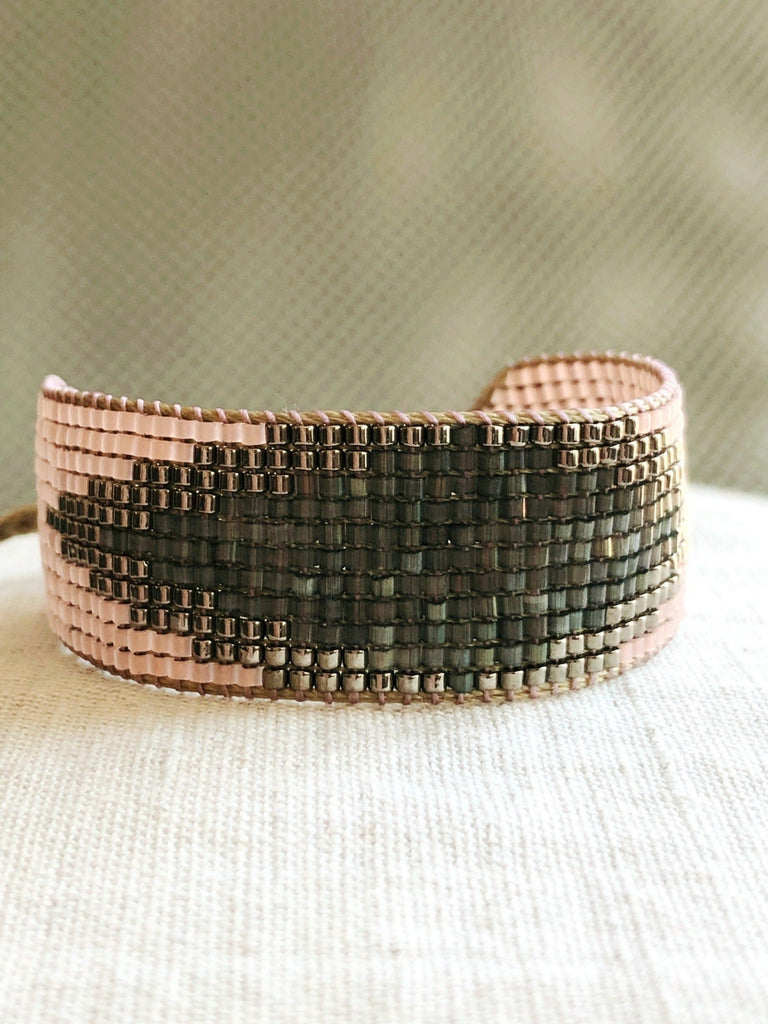 Dusty Pink, silver and translucent dark grey, woman beaded bracelet.