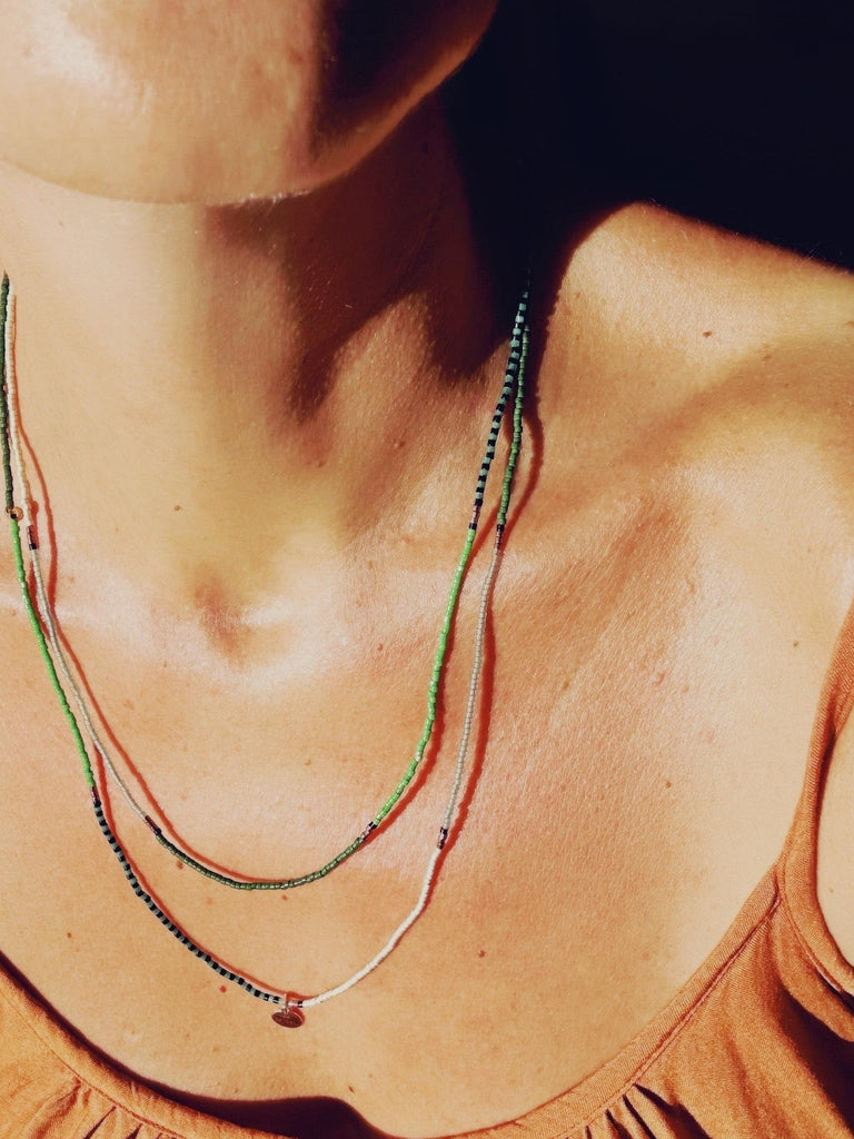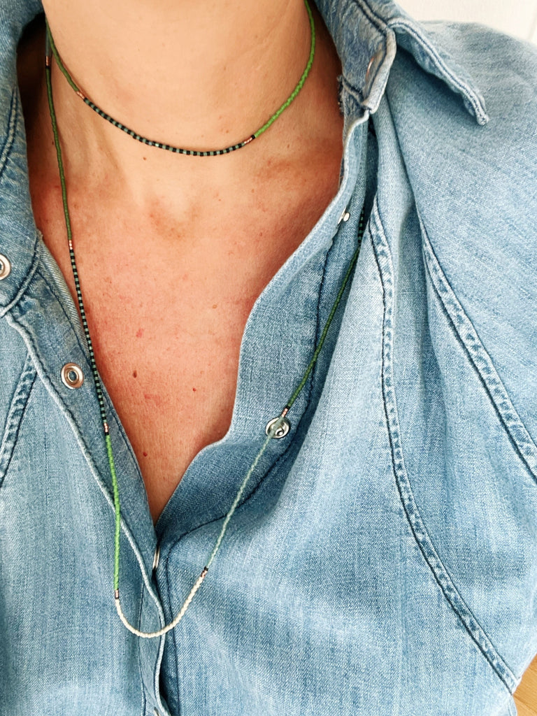 The sea's hues concentrated in a necklace.