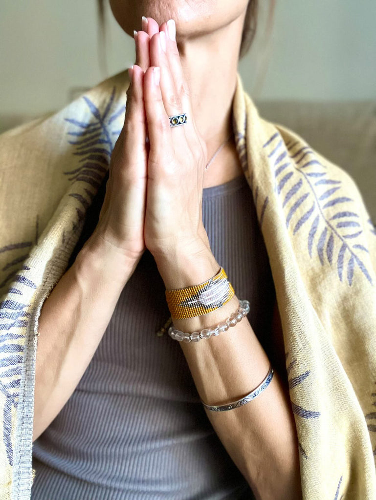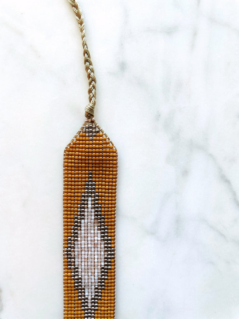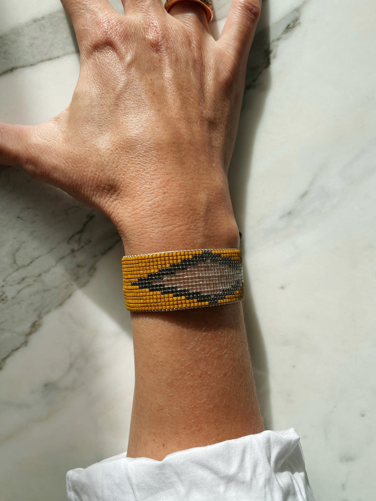 Matte mustard and transparent light pink, woman beaded bracelet. LOSANGE'S collection big brother