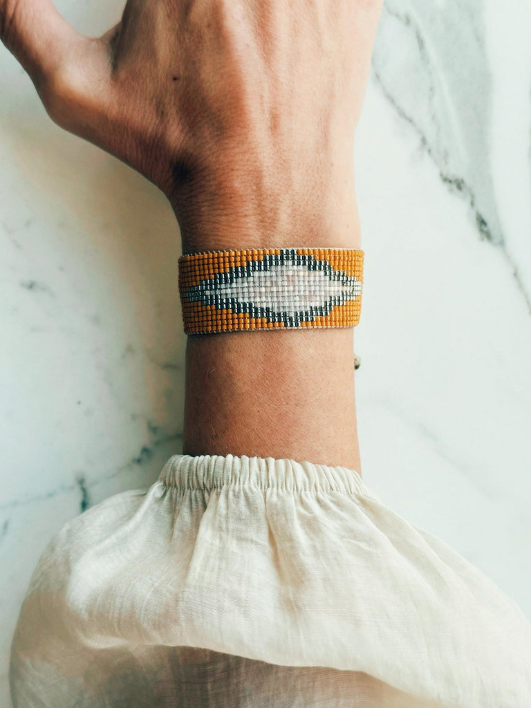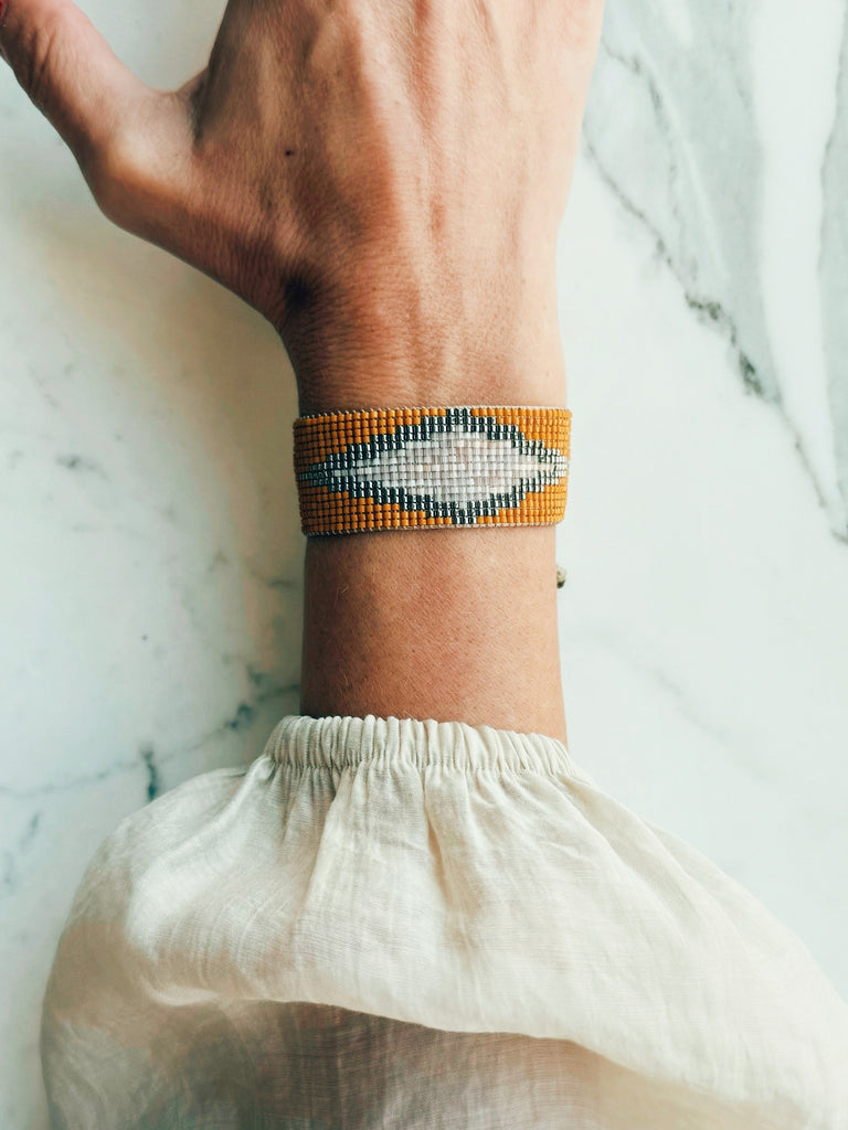Handwoven bracelet made with tiny glass Japanese beads. These are high-quality beads, very soft and regular. The result is a light and smooth bracelet, really comfortable to wear.