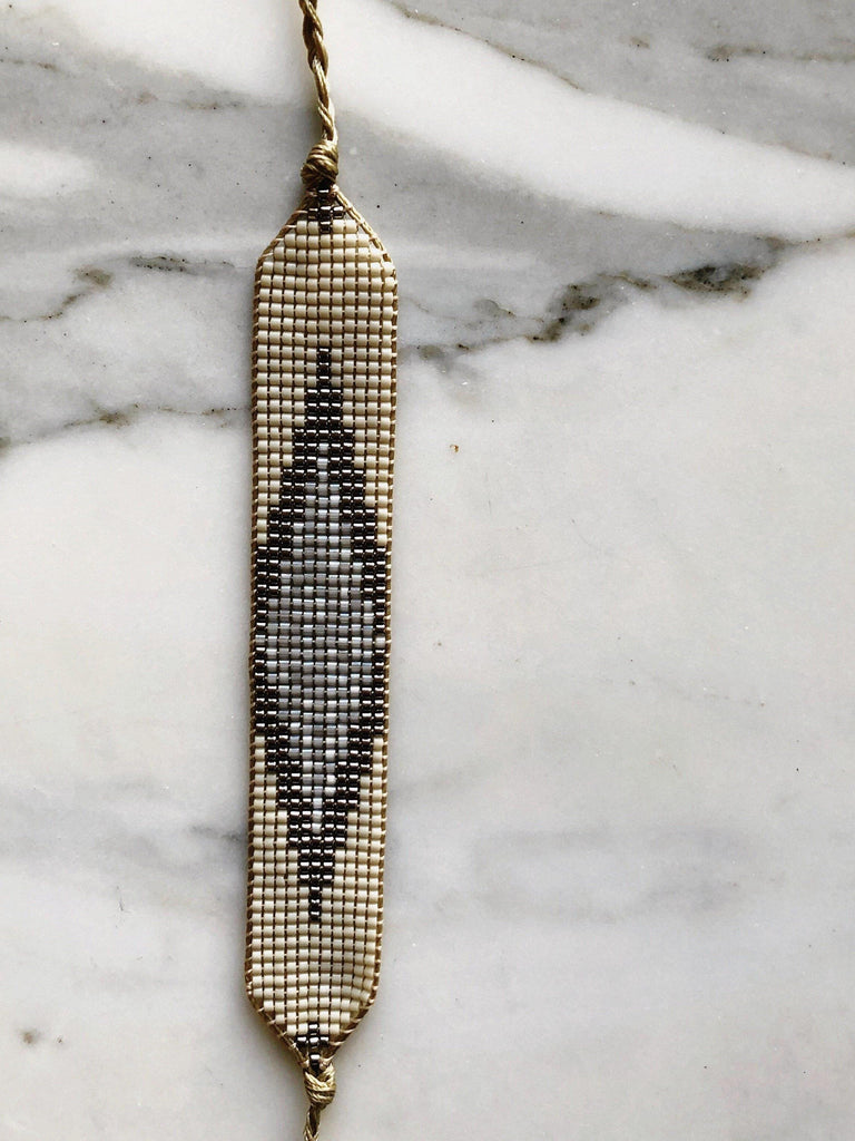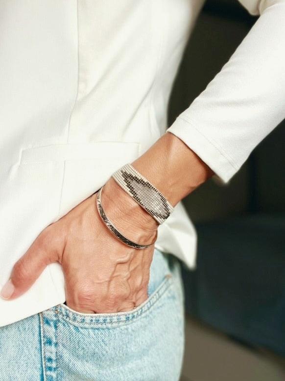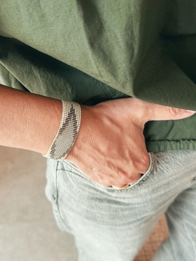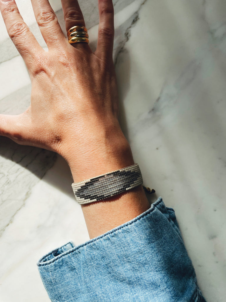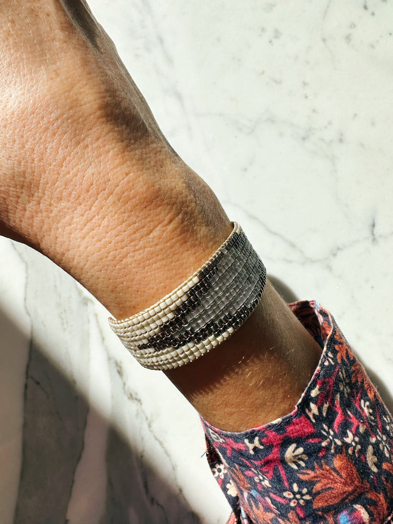 Introducing our Ivory beaded bracelet, the epitome of elegant chic. Handwoven with care using high-quality glass Japanese beads, this translucent grey and silver bracelet exudes a sophisticated charm. Its soft and regular texture makes it incredibly comfortable to wear, while the adjustable sliding knot ensures a perfect fit for all sizes. Packaged in a lovely kraft gift box, this bohemian-inspired piece is a must-have addition to your boho style collection. Please handle with care and store it safely when not in use. Avoid contact with perfumes, water, and creams to keep this handmade bracelet looking its best. With most bracelets made to order, please allow a few days for your unique piece to be crafted.